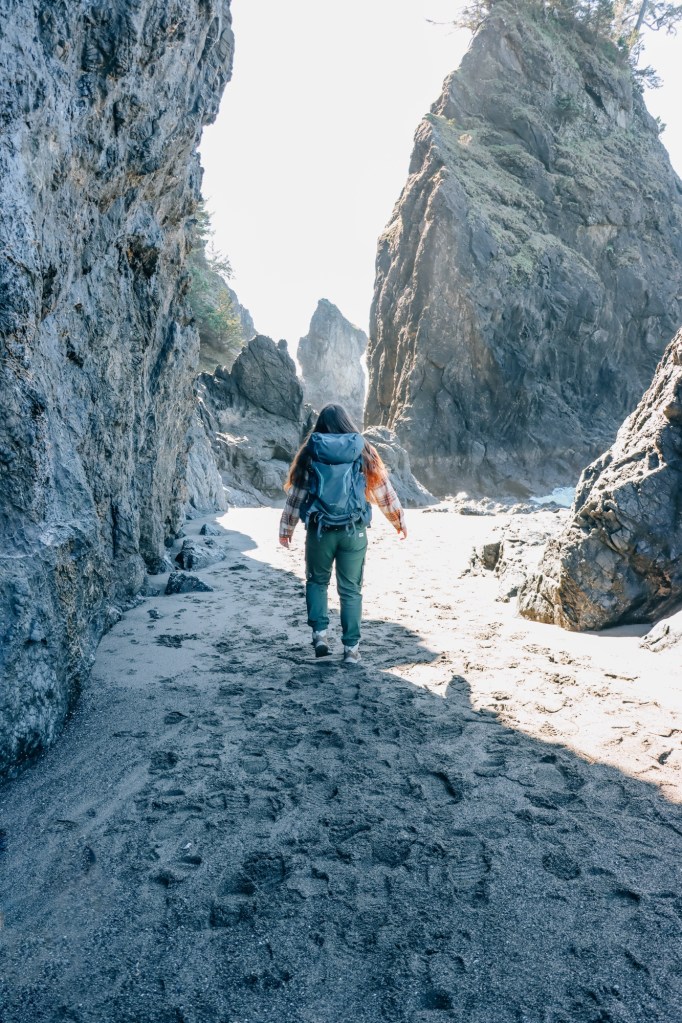 A whole hidden (literally!) oasis off the coast of Brookings, OR! You drop down slightly through tall pines and bushy ferns, before opening up into a stunning beach. This has everything – from coves, picnic spots, tide pools, and massive rock formations. We walked around the corner to find this view and our jaws Hit. The. Sand. It was insane!