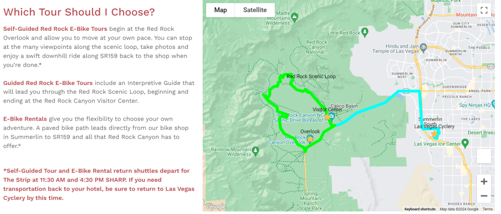 - The next morning to complete your visit within RRC, grab an E-bike rental from Red Rock E-Bike Tours. This is such a fun way to explore more of what you couldn’t fit in the day before. You can choose to bike back to the canyon yourself or use a shuttle as mentioned below at the end of the itinerary!