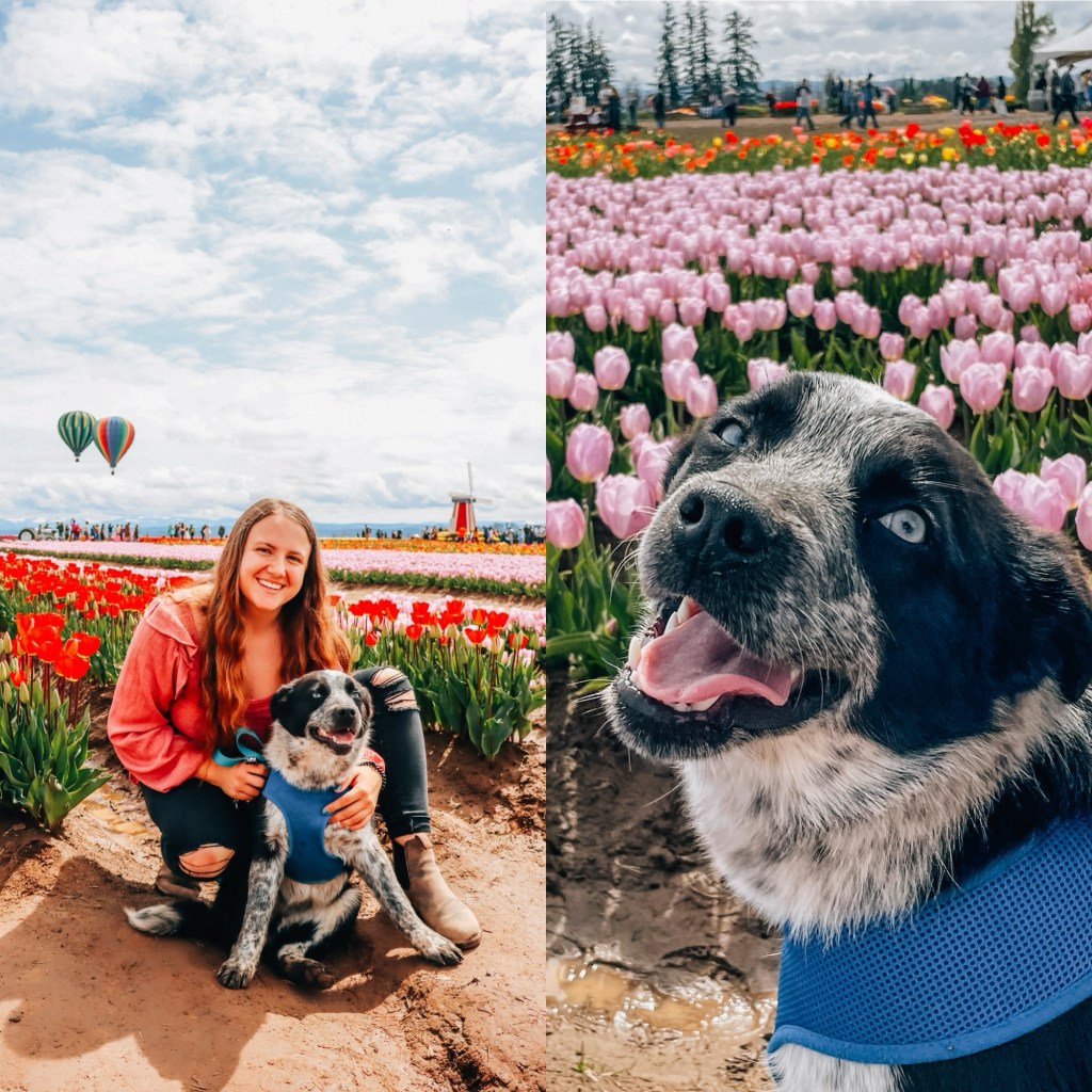 Good news! The pups are allowed at the Tulip Festival, however they are required to be on leash and expected to be friendly around other dogs and lots of human interaction. If you’ve got a super high energy or slightly reactive pup, it may be best to leave them at home for this one! Maverick got to go in April of 2023 and he loved it, if you couldn’t tell from the below pictures.
